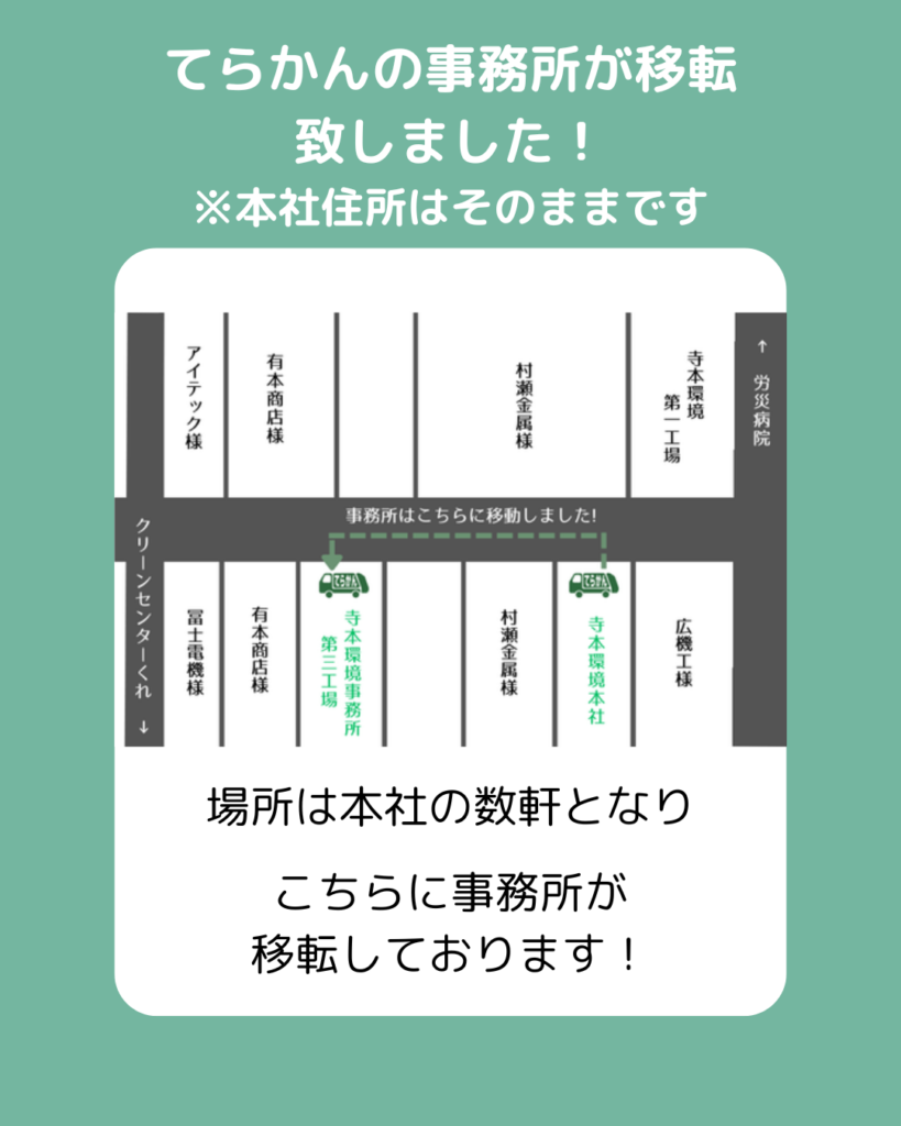 事務所内にご用の方・発泡スチロールのお持込は寺本環境事務所・第三工場2階事務所へ