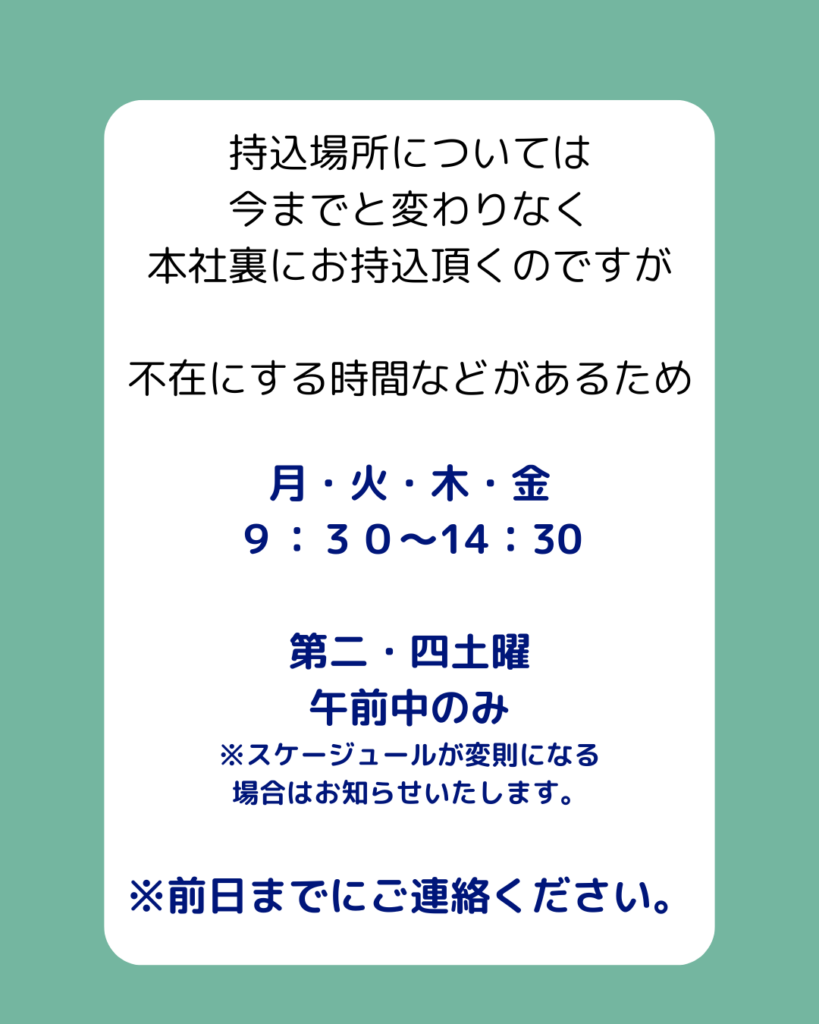 その他お持込に関しましては、本社裏へのお持込となりますが、お持込可能日をご確認いただき、