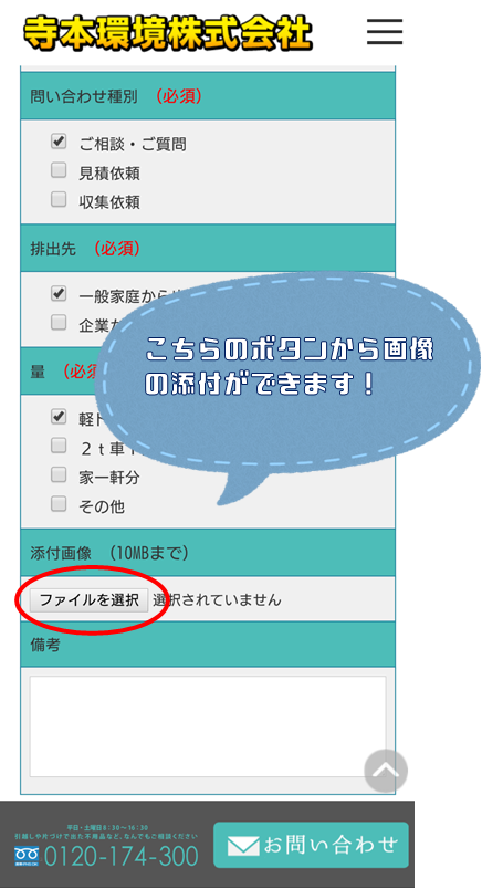 コロナ禍の影響か、写真を送ってのお見積もりを希望されるお客様が増えておられたのですが、一度問合せを送っていただいて、かえってきたメールに画像を添付して頂く…という形で、わかりづらくてお客様にお手間を取らせていたのですが、あらかじめ画像を添付したお問合せが可能になりました!