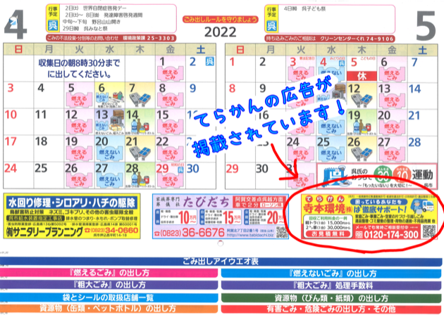 この度、2022年4月からの呉市のゴミ出しカレンダーにてらかんを掲載して頂きました!