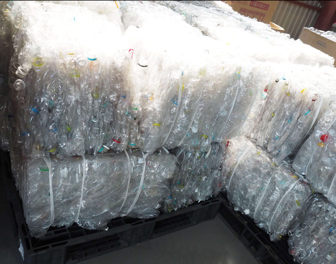 回収したペットボトルを機械に入れ、圧縮し均一な大きさの塊にします。その後リサイクルプラスチック製品の原料としてさまざまな形に加工され再利用されていきます。
