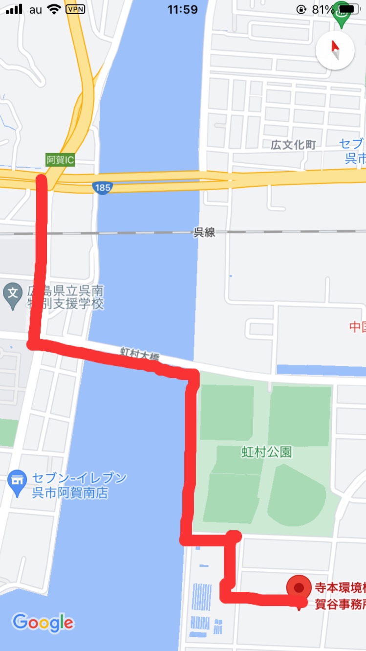 呉、阿賀方面からお越しの方はゆめマートのある角を右折、呉高専前交差点を左折、虹村大橋を渡って最初の角を右折、虹村公園の角を左折、最初の角を右折、富士電機さんのある角を左折、まっすぐ行っていただき、村瀬金属さんの事務所の向かいに事務所があるのでそちらまでお越しください。